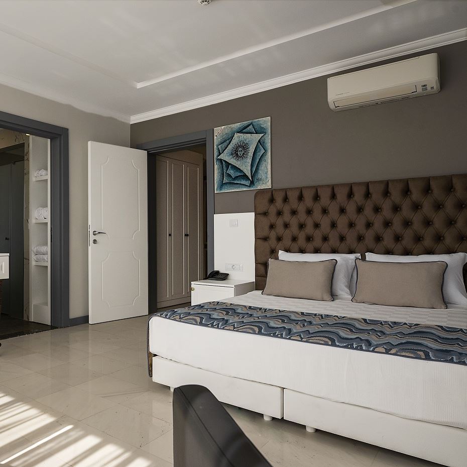 These stylish and contemporary suites feature a king bed in the bedroom and a separate living room. In the living room, there is a large sofa and a wing chair, coffee table, private jacuzzi, bathroom with a large walk-in shower, international satellite broadcasting on the LCD TV, comfortable pillow selection, kettle, complementary tea/coffee set-up and water, complementary minibar, hair dryer, safe-box, telephone, vanity/work desk and a balcony.